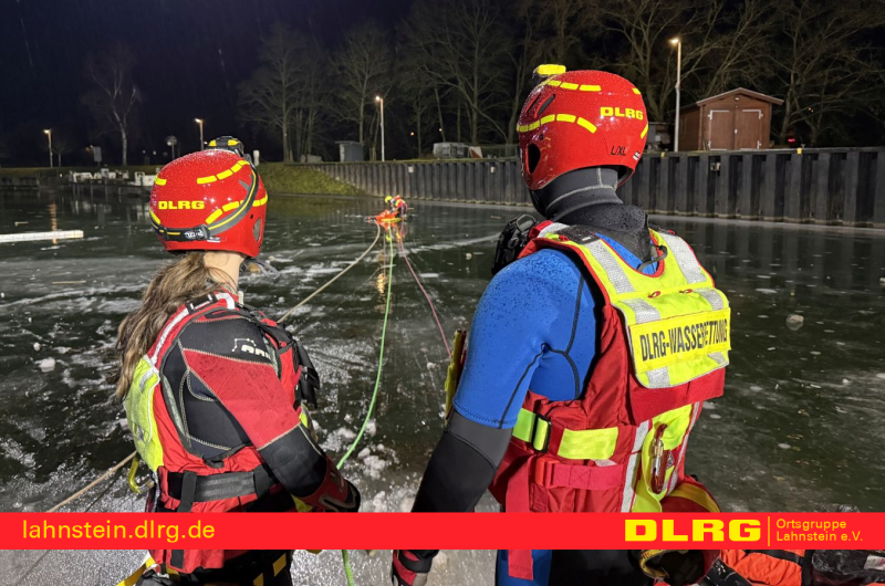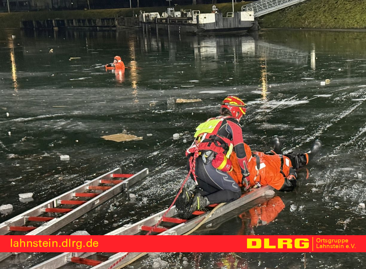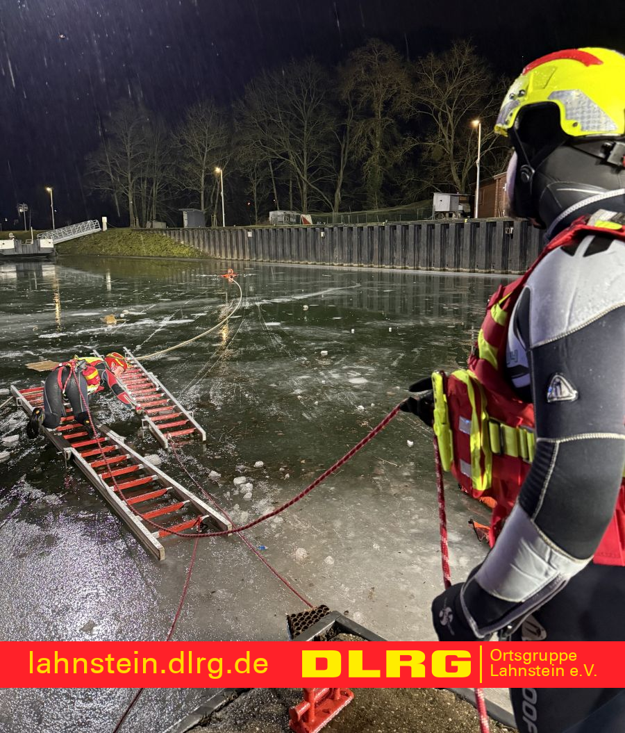 Am gestrigen Abend (08.01.2026) nahm die DLRG Ortsgruppe Lahnstein gemeinsam mit der Freiwilligen Feuerwehr Lahnstein, der Berufsfeuerwehr Koblenz sowie dem THW Lahnstein an einer umfangreichen Eisrettungsübung teil. Übungsort war die Lahn oberhalb der Lahnsteiner Schleuse, die aufgrund der anhaltend niedrigen Temperaturen dort zugefroren war – ideale Bedingungen für ein realistisches Übungsszenario.
