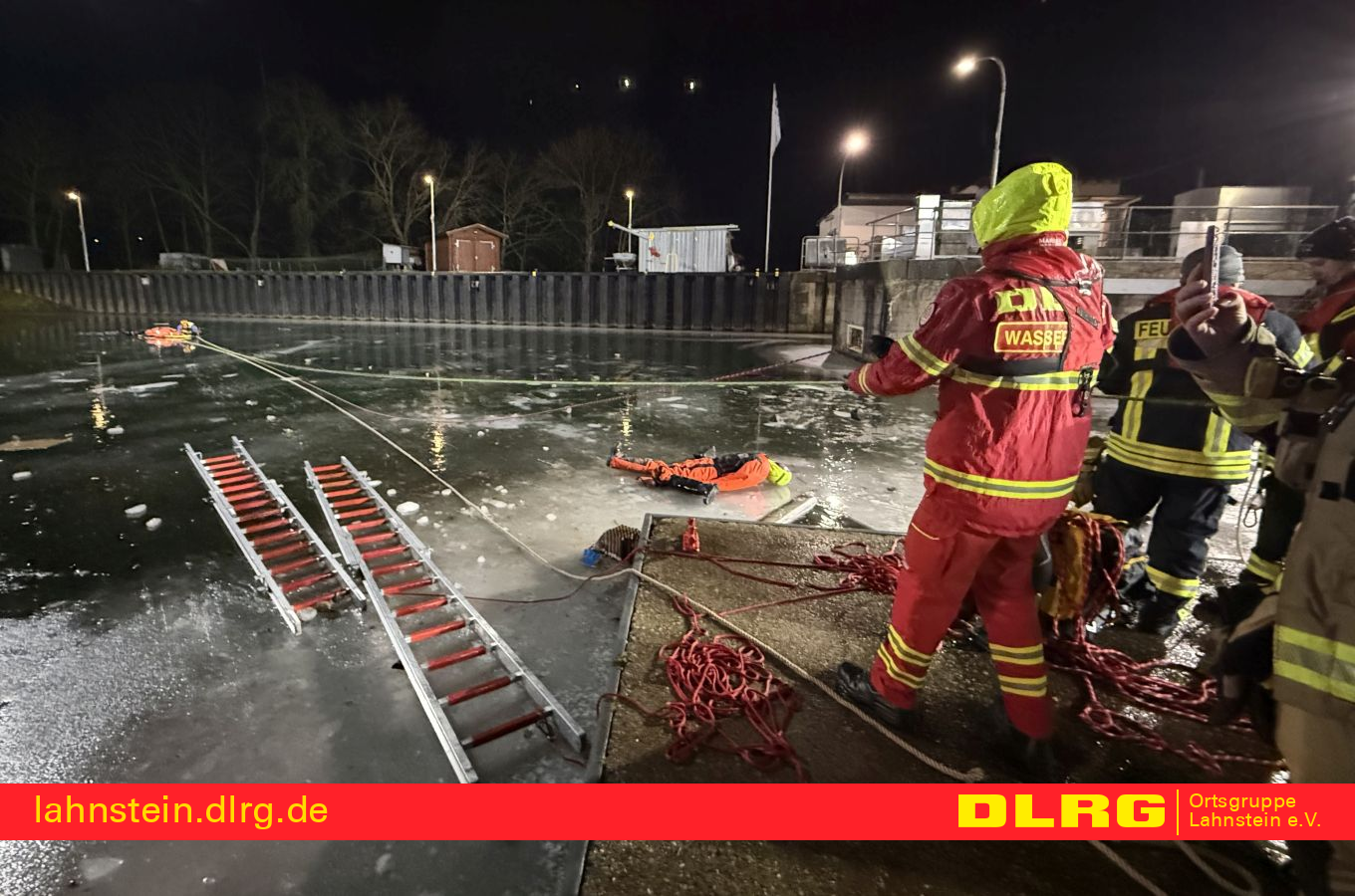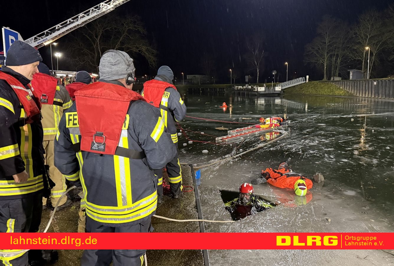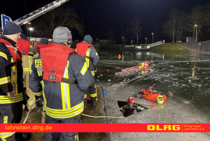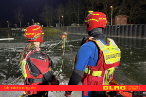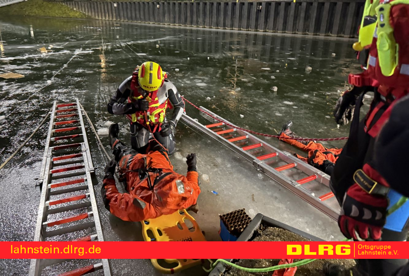 Die DLRG Lahnstein war mit insgesamt sechs Einsatzkräften vertreten. Vier ausgebildete Strömungsretter begaben sich zur Personenrettung nach und nach auf das Eis, während zwei weitere Helfer die Maßnahmen von Land aus zusätzlich unterstützten und absicherten. Schwerpunkt der Übung für die DLRG war das sichere Vorgehen auf Eisflächen. Mit Hilfe von Steckleitern und einem Spineboard wurde trainiert, sich kontrolliert zur Einbruchstelle vorzuarbeiten und eine eingebrochene Person aus dem Gefahrenbereich zu retten.